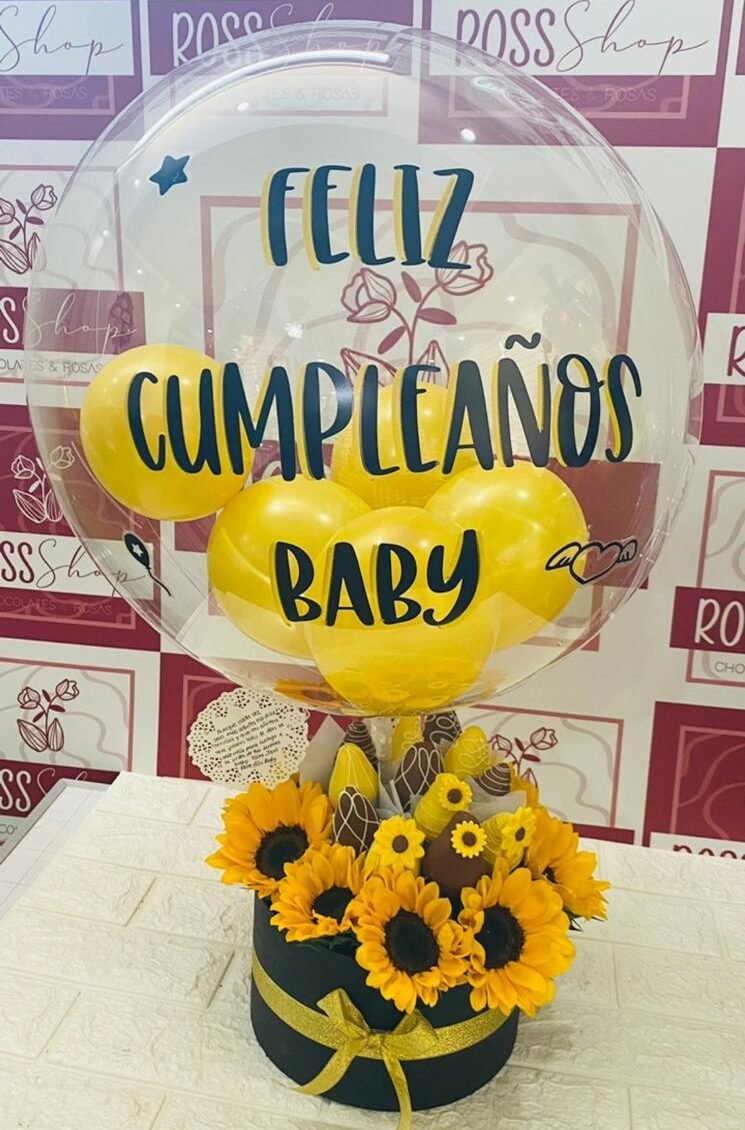 + EnvíoCaja de regalo circular, girasoles, fresas premium en dos tonos de chocolate, globo personalizado (hasta 5 palabras)