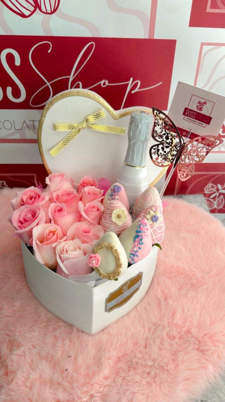Caja de corazón, rosas, botella de espumante, fresas premium.