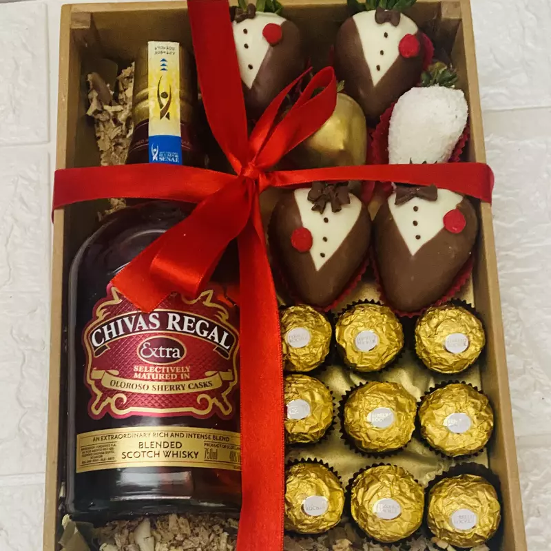 + EnvíoCaja de madera, botella Chivas, chocolates Ferrero, fresas premium smoking
