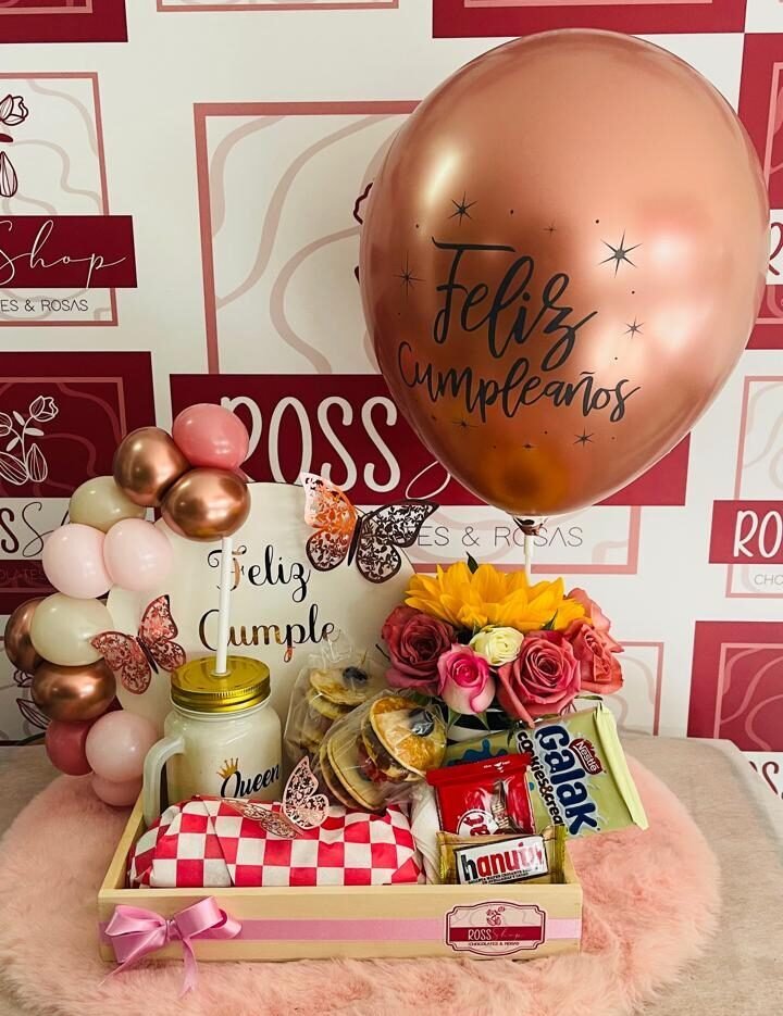 Caja de madera, arreglo de flores en tacita, sanduche de pollo o jamón, jugo de naranja, mini pancakes con nutella y fresas, mini arco de globos con fondo personalizado, dulces premium, globo con temática.