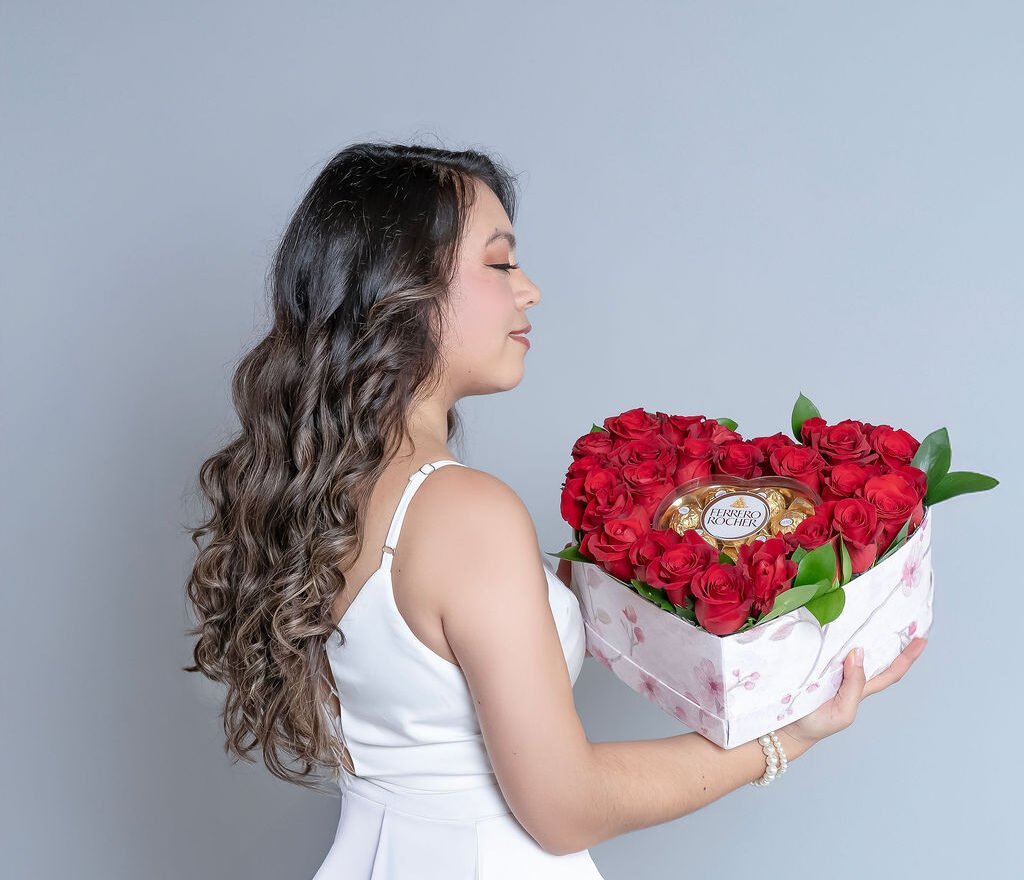 + EnvíoCaja de corazón con arreglo de rosas rojas y chocolates ferrero en forma de corazón.