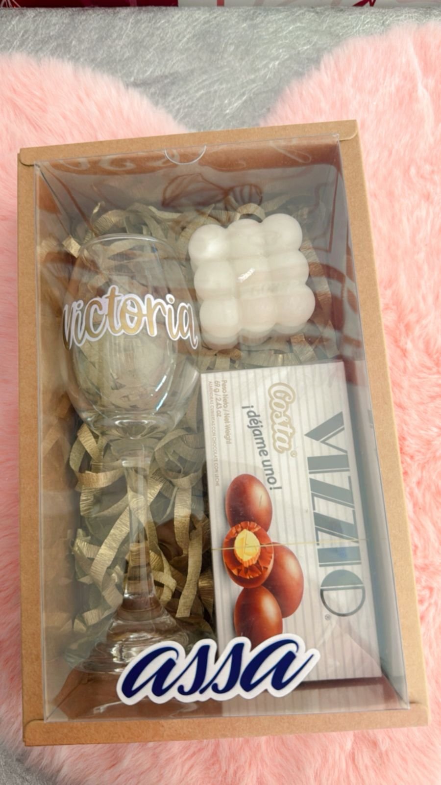 Caja de regalo con copa personalizada, chocolates visio, vela de soya premium.