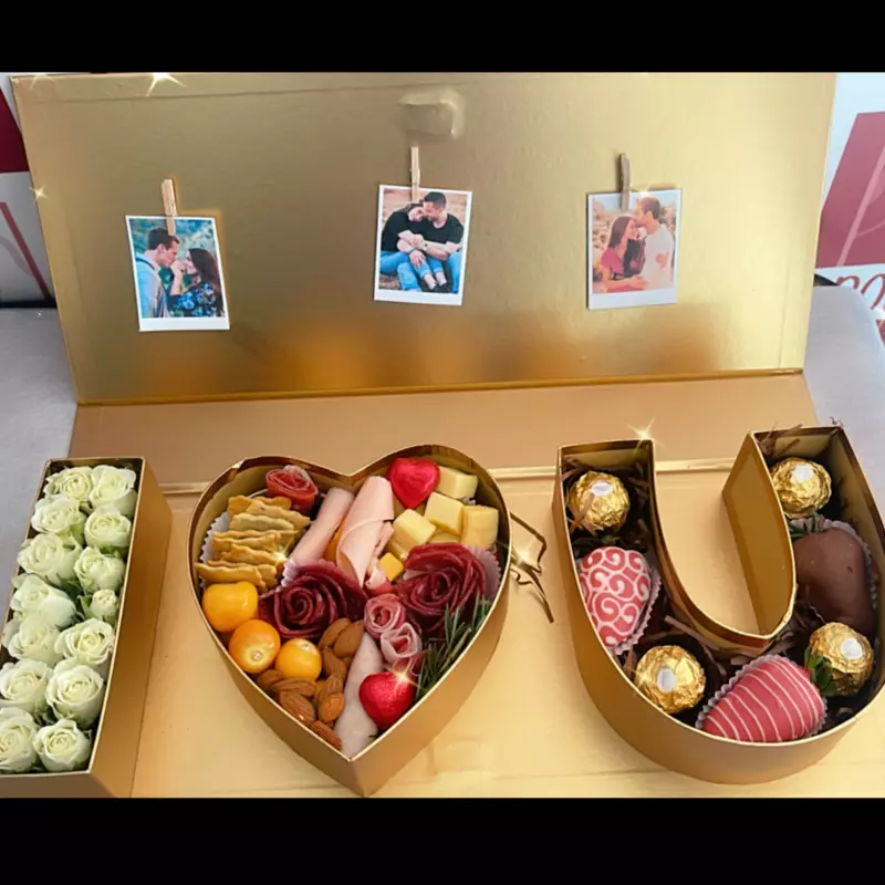 Caja I❤️U con frase personalizada, 3 fotografías, minirosas, Ferreros, fresas con chocolate, picadita premium
