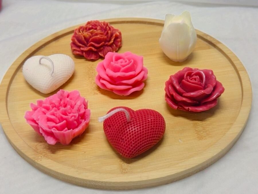 Vela de soya en diseños de rosa, peonia, tulipán, corazón.