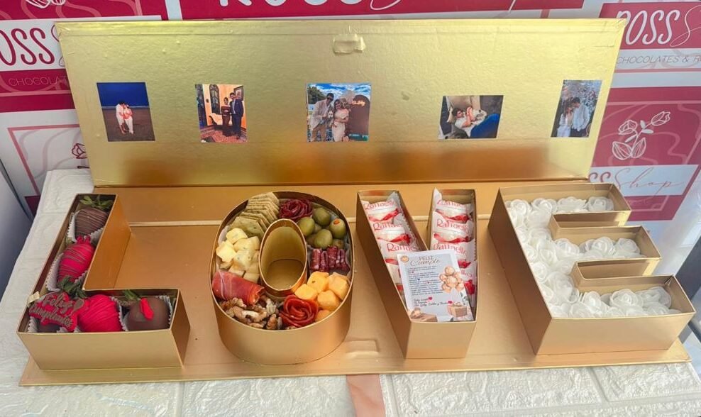 + EnvíoCaja de regalo LOVE con fotos personalizadas, fresas premium, mini picadita, chocolates rafaello, flores eternas.
