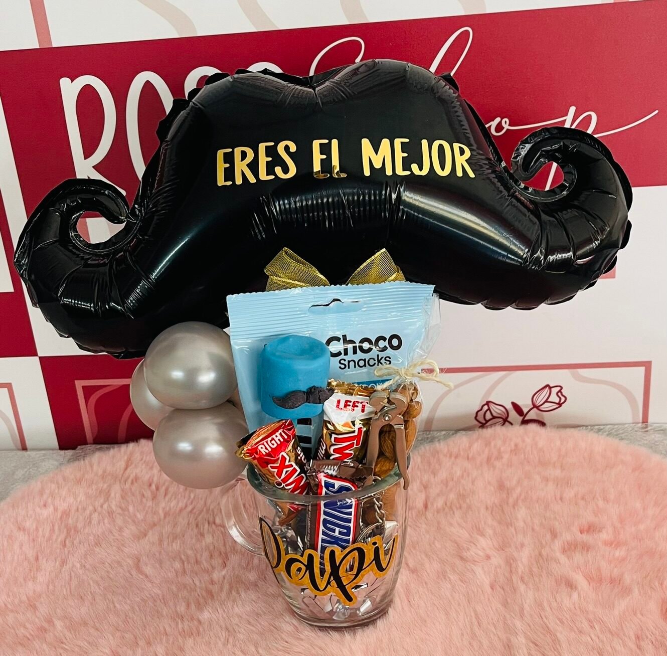 + EnvíoTaza personalizada con nombre, globo bigote personalizado (3 palabras), dulces, marshmallows.
