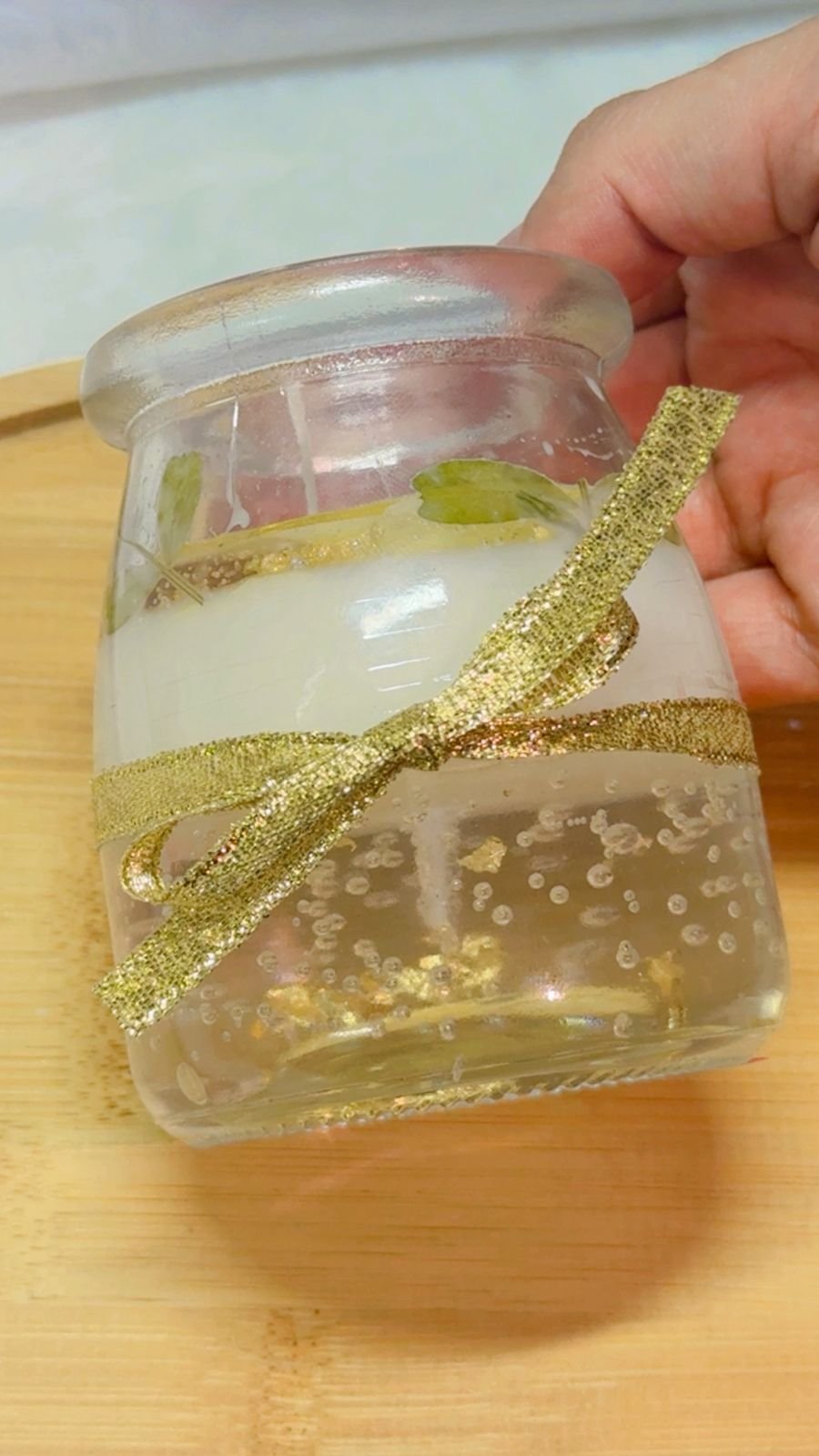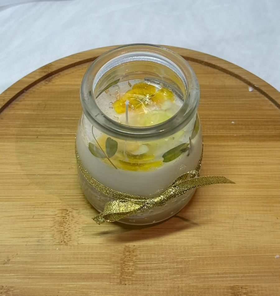 Vela con cera de soya y cera en gel con flores eternas, cinta con lazo.