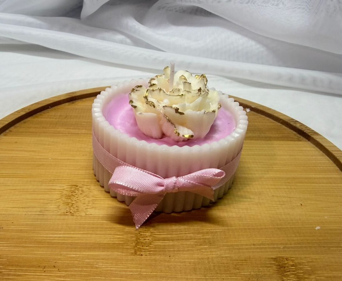 Vela circular con cera de soya y cera en gel decorada con corazones flotantes, destellos dorados.
